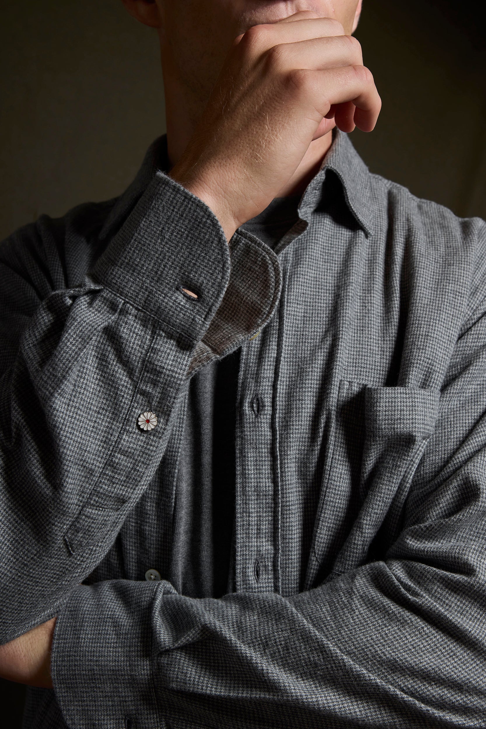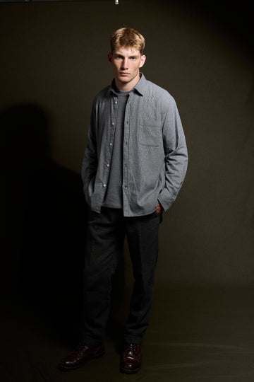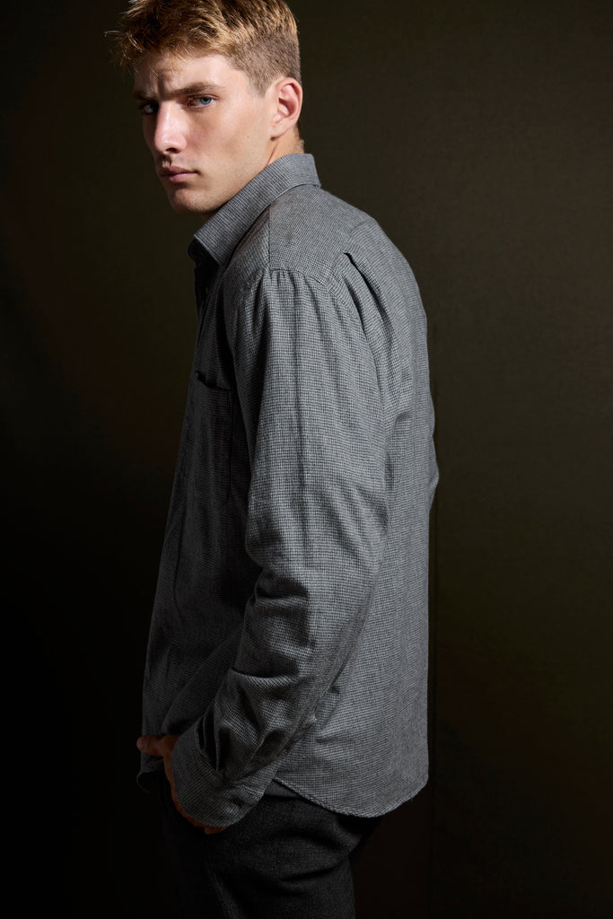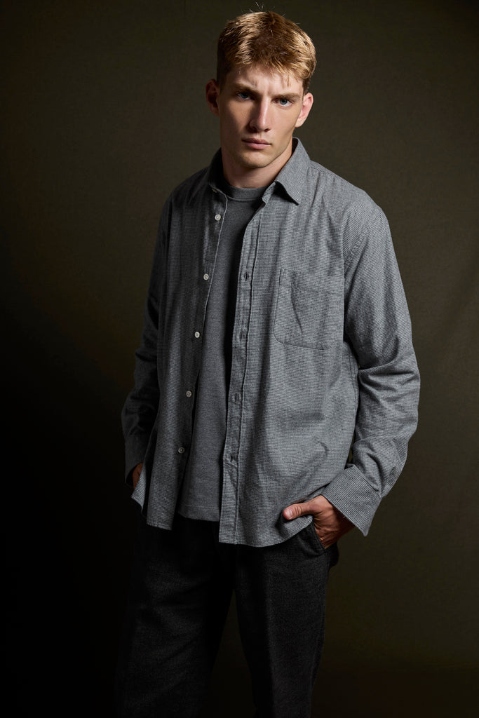 Camisa franela ligera en pata de gallo tonos grises con bolsillo.