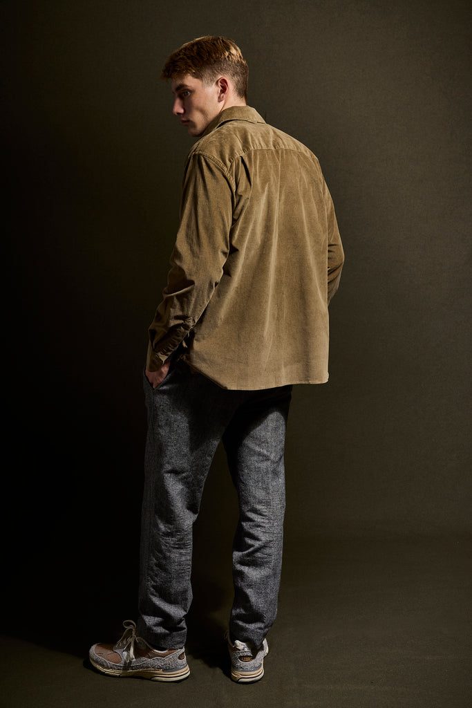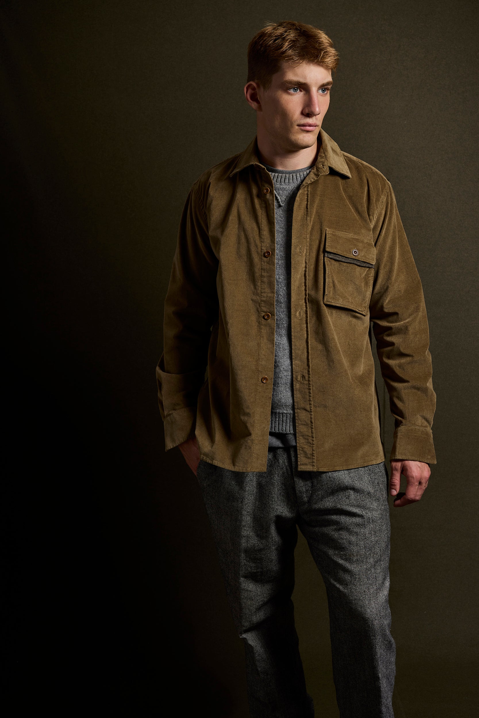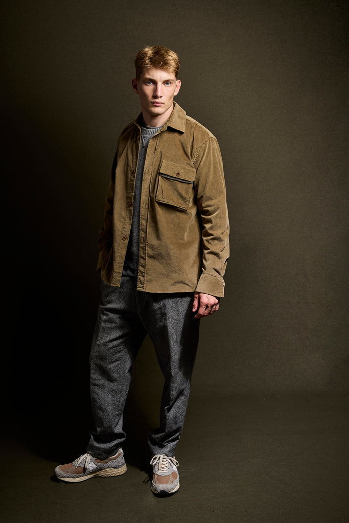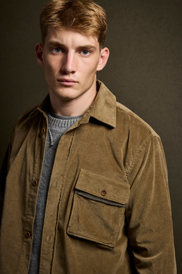 Sobrecamisa en terciopelo beige lavado. Bolsillo con fuelle y tapeta.