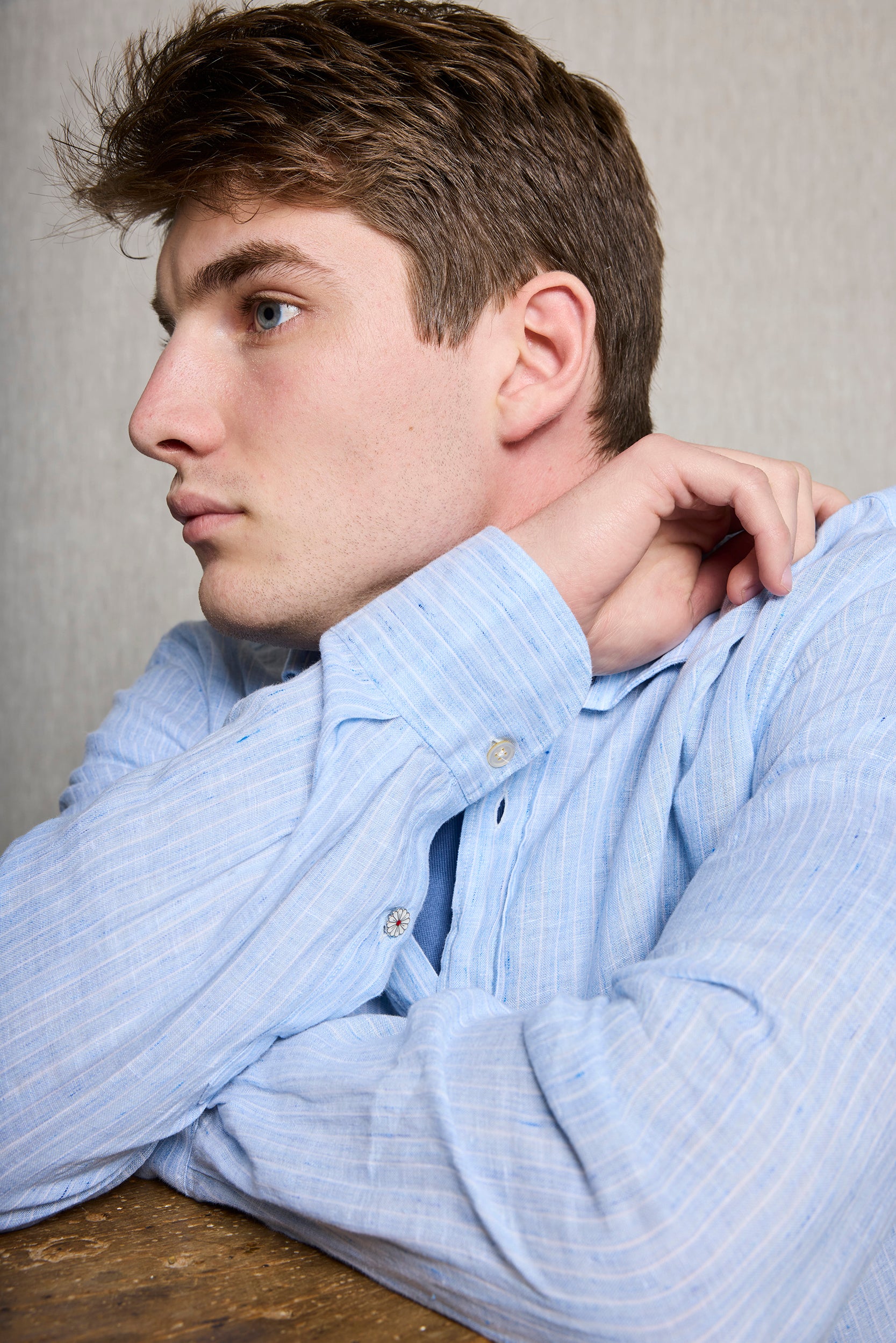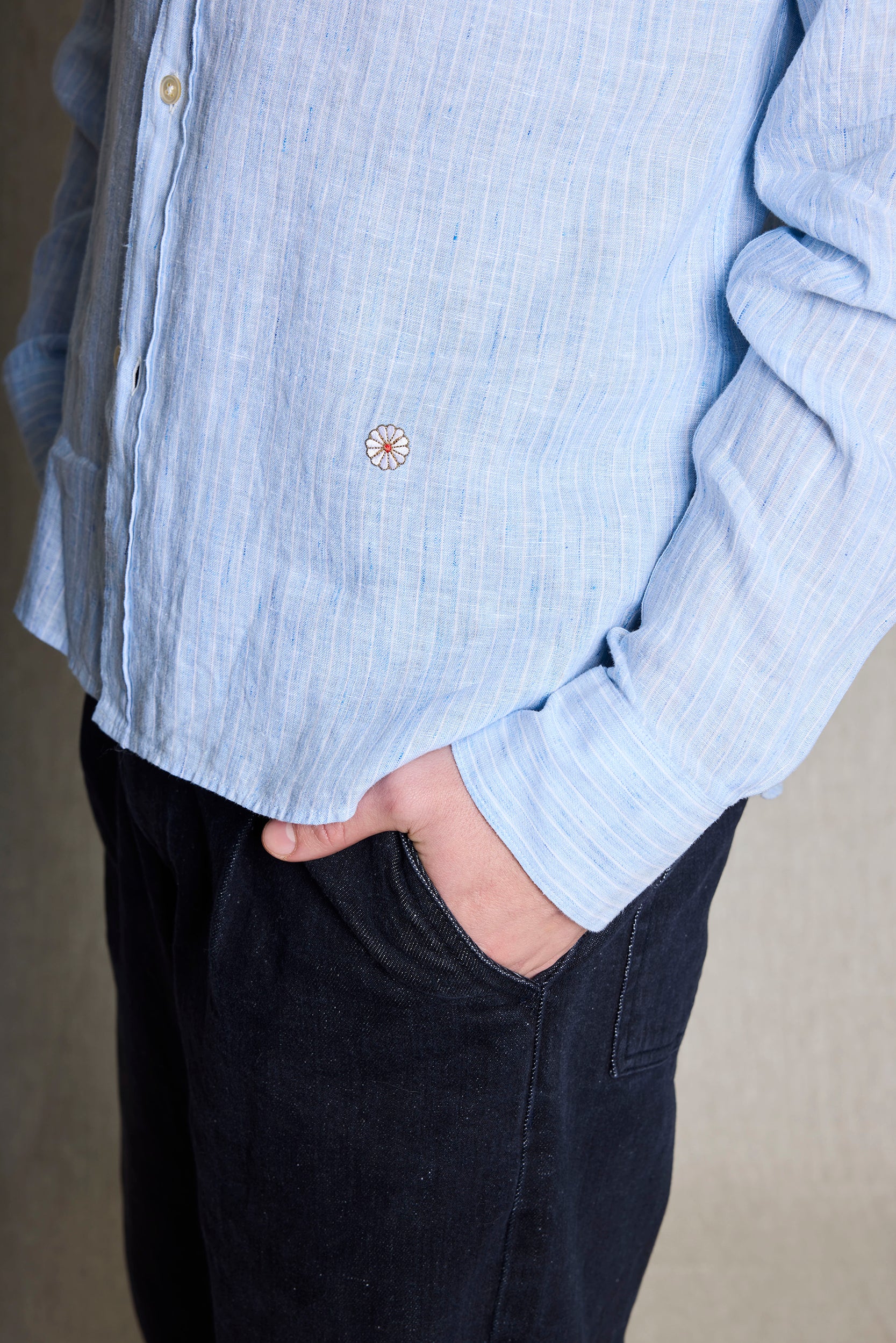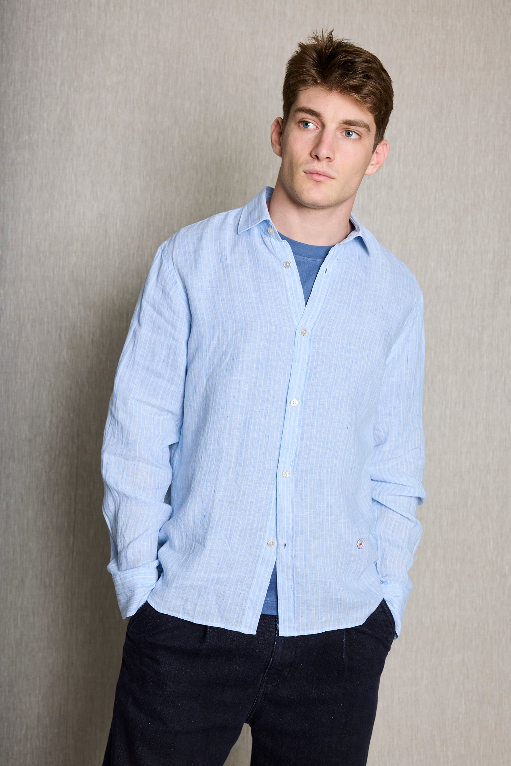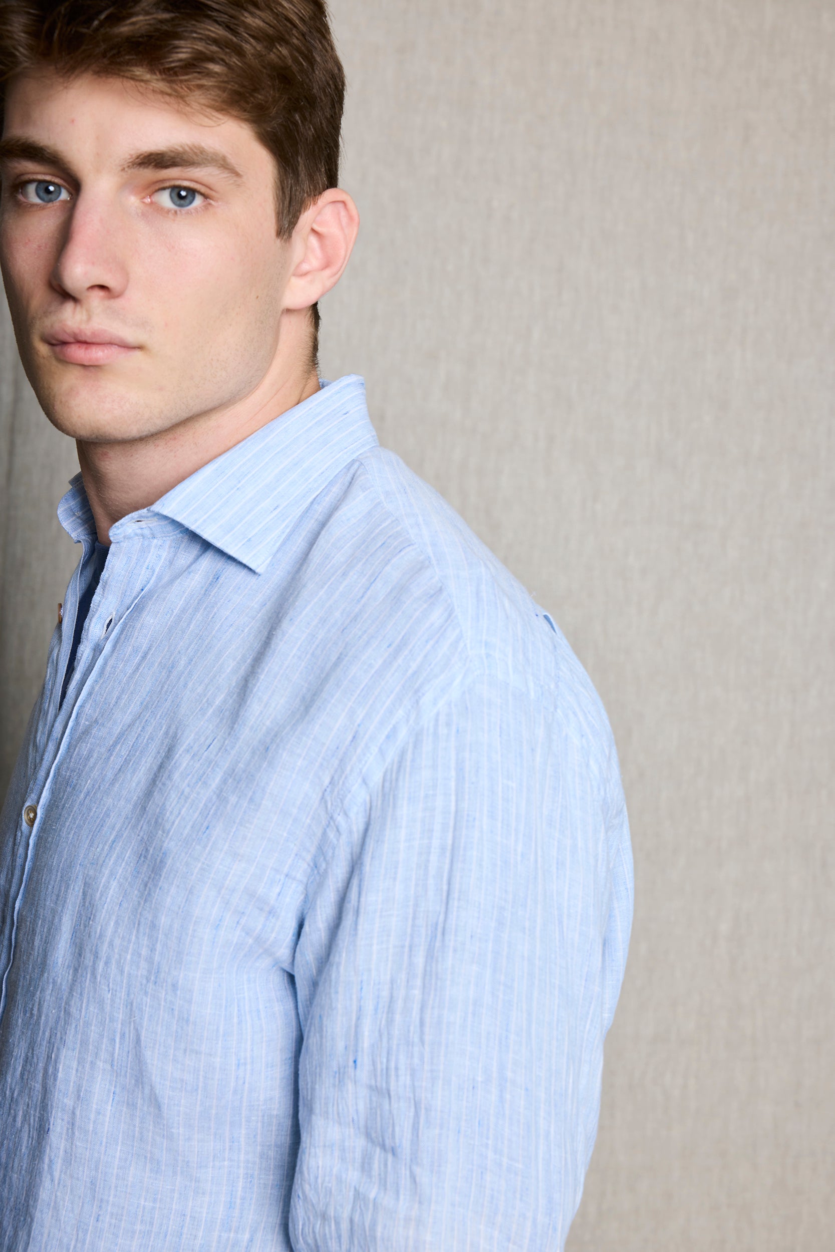 Camisa rayas blancas en lino 100% fondo azul.